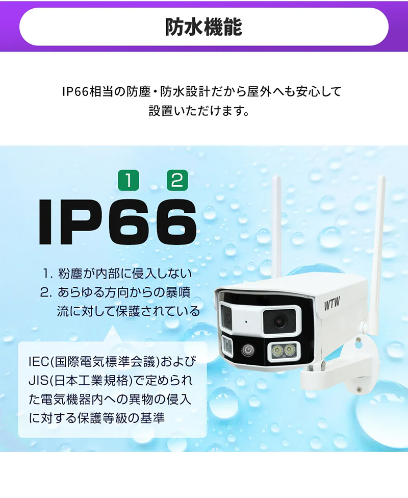 ●本機の防水IP56相当とは30分程度までの生活防水です。完全防水ではありません。