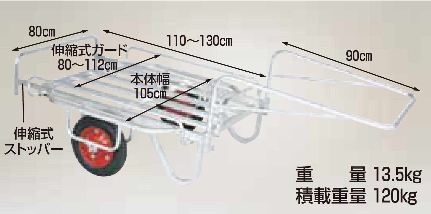 型式 BS-1108 タイヤタイプ エアータイヤ (TR-13×3T) 重量 13.5kg 積載重量 120kg 荷台有効長 110cm~130cm(伸縮式) 荷台有効幅 80cm~112cm(伸縮式ガード) ハンドル長 90cm 全幅 約105cm(本体幅) 積載目安 20kg用コンテナ 6個 - 北海道・九州への配送は別途送料がかかります。また、離島は別途見積もりとなります。