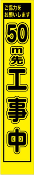 工事看板 【50m先工事中】 プリズム蛍光高輝度 W275mm×H1400mm スリムタイプ 【鉄枠付】 安全標識 工事中看板 PWS-40Y-50