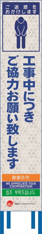 工事看板 ご協力お願い致します 4ヵ国語表記入り 訪日観光者対応 高輝度白反射 スリムサイズ JEDロゴ入り 【鉄枠付】|保安用品のプロショップ メイバンオンライン