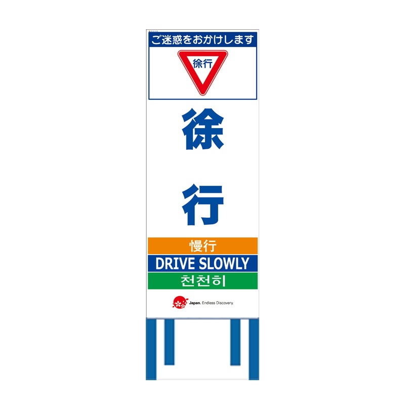 工事看板 【徐行】 4ヵ国語表記入り JED-W-10 訪日観光者対応 高輝度白反射 550mm×1400mm JEDロゴ入り 観光庁 【鉄枠付】