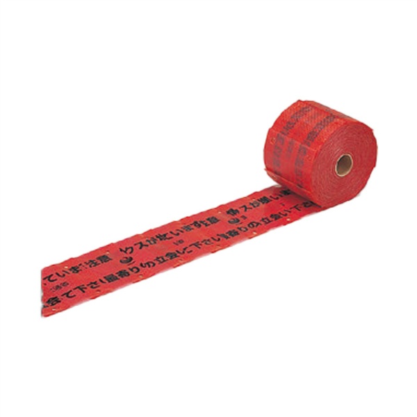 埋設標識シートは地下埋設物と地表との中間に敷設され、掘削工事中に機械に巻きつくことにより、埋設物の所在と内容を警告する役割を果たすものです。