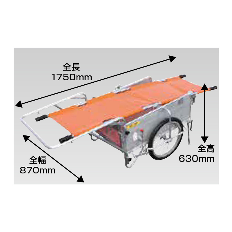 仕様 ブレーキ・スタンド・担架付 タイヤタイプ 20インチ・ノーパンクタイヤ 自重 28kg 最大積載重量 100kg 寸法 全長1750mm×全幅870mm×全高630mm