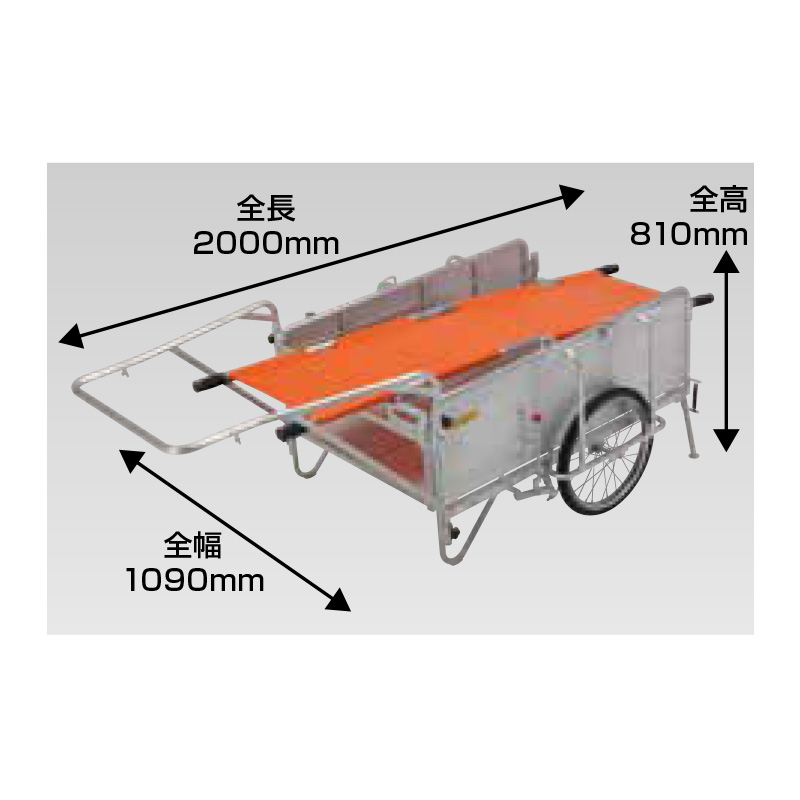 仕様 ブレーキ・スタンド・担架付 タイヤタイプ 20インチ・ノーパンクタイヤ 自重 39kg 最大積載重量 130kg 寸法 全長2000mm×全幅1090mm×全高810mm