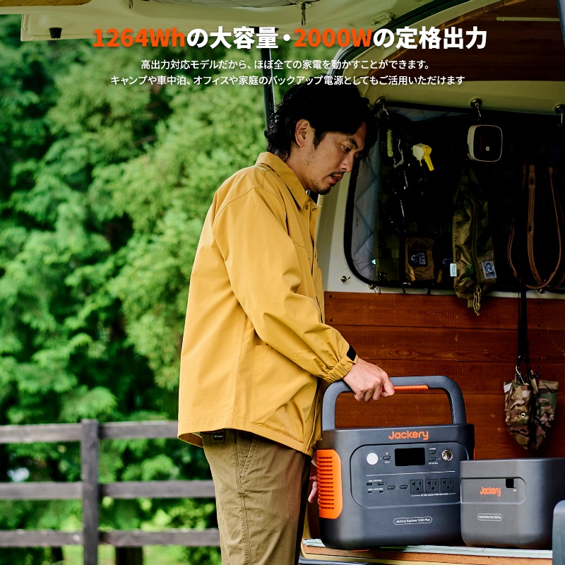 Jackery ポータブル電源 1000Plusは1264Whの大容量と2000Wの定格出力が可能なため、スマホ、ノートパソコン、LEDランタンの充電から電子レンジやホットプレート、電気ケトルなどの高出力家電も含む、ほぼ全ての家電を動かすことができます。