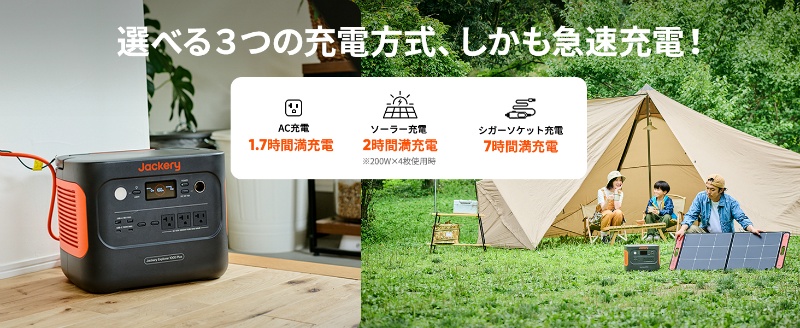 ソーラーパネル200W×4枚で接続した場合、約2時間でフル充電ができます。