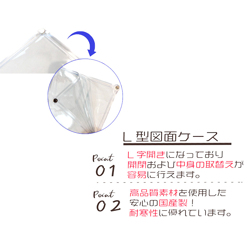 - L字開きで開閉・中身の取り替えが容易。 片側が大きく開くので、図面や書類の出し入れ・差し替えがスムーズに行えます。
