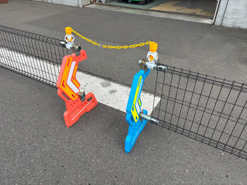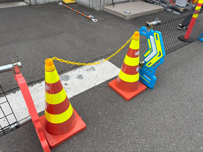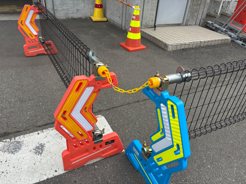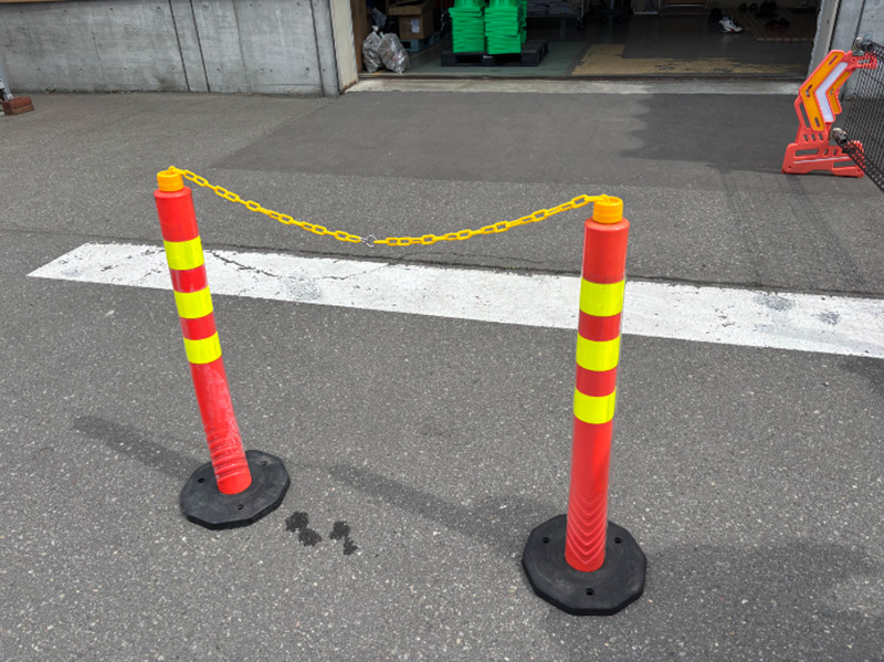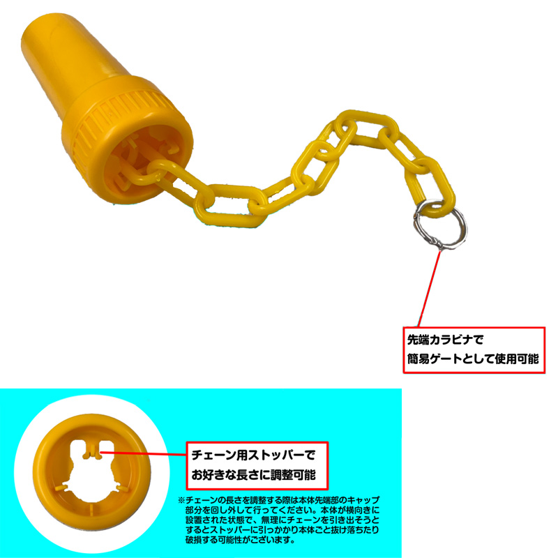 - 単管端部の保護キャップとしても機能 単管の端部に装着して保護しつつ、チェーン機能で立入制御も可能です。