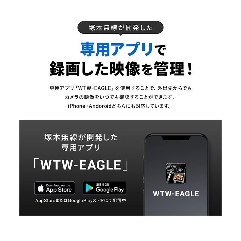 ※録画データーの入ったMicroSDカードをPCに直接接続しても録画内容を再生することはできません。【視聴アプリ】 アプリ名 WTW-EAGLE VIP 対応端末 iPhone / Android