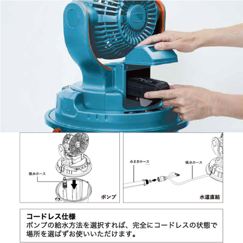 「ミストワークファン」は水道・電源が無い場所でも使えるコードレスミストファンです。