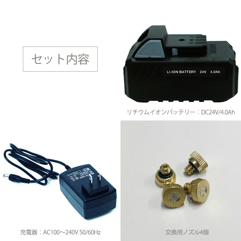 交換用ノズル:4個バッテリー電圧 DC24V バッテリー容量 4.0Ah 稼働時間 約5.5~9.5時間
