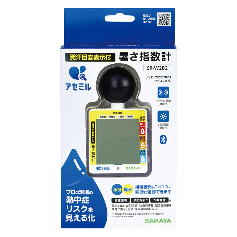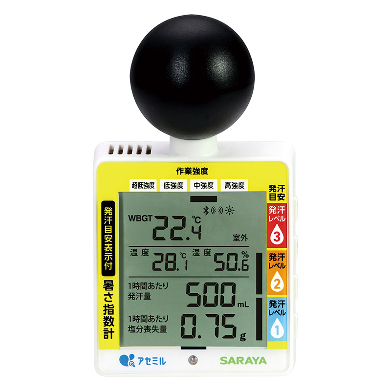 商品名 アセミル発汗目安指数計 W2B2 メーカー商品コード 21461 本体寸法 W65.9mm × H117mm × D50mm 黒球寸法 φ40mm 重量 約78.9g(電池なし) 電源 単4アルカリ乾電池 2本(付属しておりません) 温度測定範囲 0.0~50.0°C(精度: ±0.6°C / 20.0~50.0°C) 湿度測定範囲 10.0~95.0%RH WBGT測定範囲 0.0~50.0°C(精度: ±2.0°C) 警告アラーム ブザー:75dB/OFF、LED:ON/OFF 無線技術 Bluetooth® 使用環境 温度:0~50°C、湿度:10~90%RH(結露無きこと)、風速:0.3m/s以上 規格 JIS B 7922:2023 クラス2準拠
